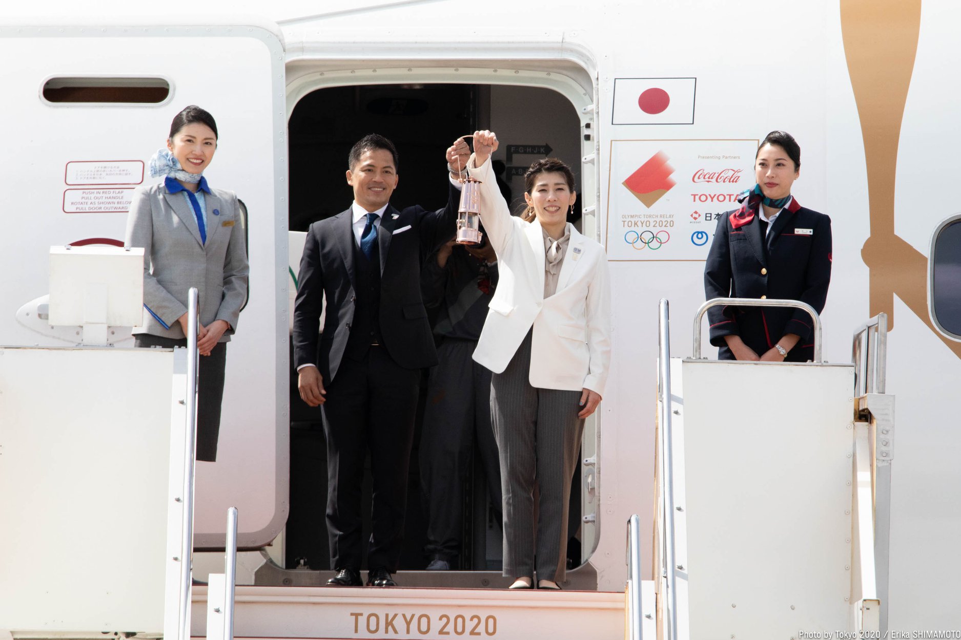 Olimpijski ogenj sta ob prihodu iz letala prevzela nekdanja japonska olimpijca Saori Yoshida in Tadahiro Nomura ter z njim prižgala japonsko plamenico v obliki češnjevega cveta. Vodja organizacijskega odbora iger Yoshiro Moti je ob tem dejal, da upa, da bo ogenj pregnal virus sars-cov-2 ter bil navdih in upanje prebivalcem Japonske.