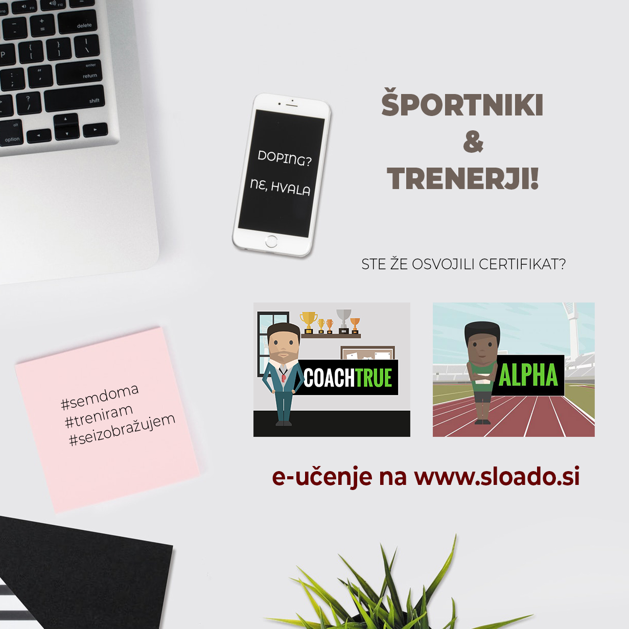 Slovenska antidoping organizacija poziva vse športnike in člane spremljevalnega osebja, da izpolnijo module spletnega e-izobraževanja - ALPHA za športnike in COACH TRUE za trenerje ter tako obogatijo svoje znanje. Dostop do e-izobraževanja je možen na www.sloado.si/kategorija/e-izobrazevanja.