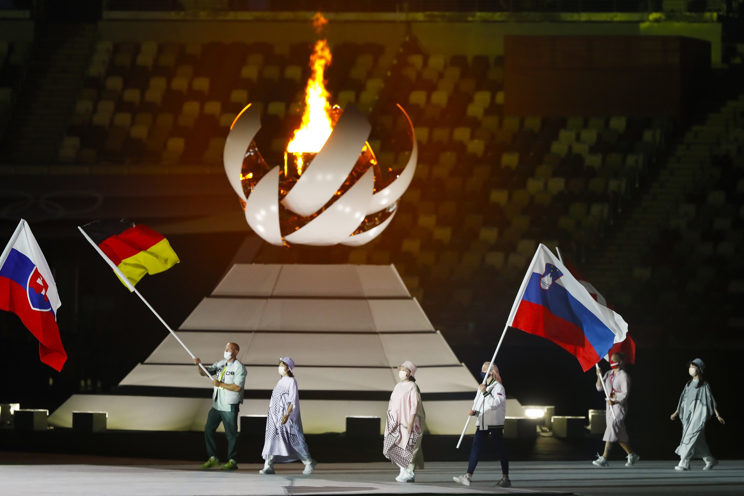 Najprej so nosilci zastav v sredini olimpijskega stadiona sklenili krog, ob spremljavi glasbe pa so ga zapolnili športniki, ki so še ostali v Tokiu. Slovensko zastavo je nosila zlata olimpijka v športnem plezanju Janja Garnbret. Po prihodu športnikov pod prazne tribune - tako kot na otvoritveni slovesnosti tudi tokrat niso bili prisotni gledalci - je prizorišče osvetlil slap lučk, ki so se nad športniki oblikovale v olimpijske kroge, simbol olimpijskih iger.