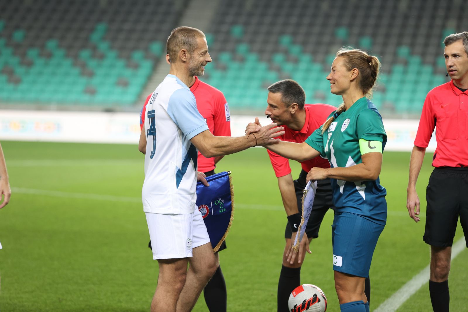 Nogometna tekma, na kateri je bil rezultat povsem drugotnega pomena, se je končala sicer v korist ekipe UEFA / NZS s kapetanom Čeferinom. Ta je bila od zasedbe OKS boljša s 4:3, a za uspešen razplet trepetala vse do konca. Slovenski olimpijci so namreč v končnici izjemno zapretili, dosegli dva zadetka, njihov nalet pa je nato zaustavil zadnji sodniški pisk. Posebna čast je na tekmi pripadla Janji Garnbret, ki se je poleti zapisala v zgodovino iger kot prva zmagovalka v športnem plezanju. Na tokratnem druženju ji je pripadla prva podaja.