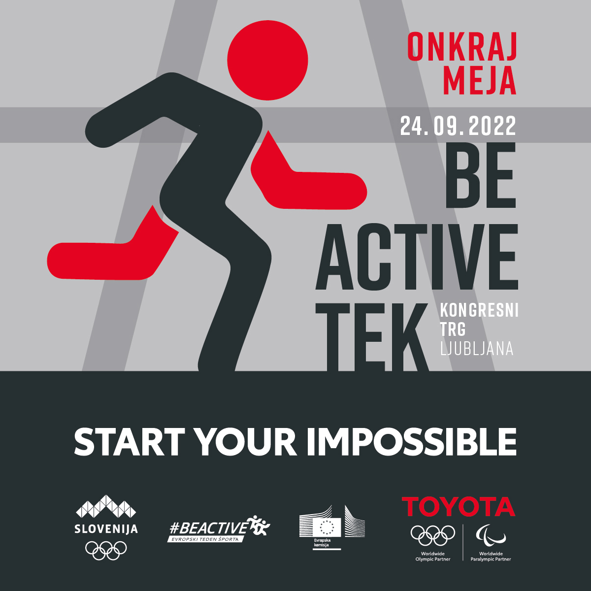 Bliža se Evropski teden športa, ki ga na pobudo Evropske komisije obeležujemo med 23. in 30. septembrom. Vabimo vas, da se nam v soboto, 24. septembra pridružite na #BeActive teku - brezplačnem skupinskem teku v sodelovanju s Toyota Slovenija in Olimpijskim ter Paralimpijskim komitejem Slovenije.