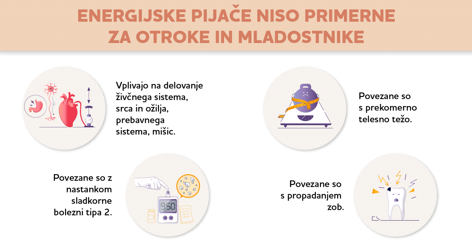 Energijske pijače so povezane z vrsto zdravstvenih težav in tveganih vedenj pri otrocih in mladostnikih. Olimpijski komite Slovenije skupaj z Ministrstvom za zdravje, zdravstveno, prehransko in športno stroko, ob podpori nevladnih organizacij, ki se ukvarjajo z zdravjem mladih, opozarjamo, da energijske pijače niso primerna pijača za otroke in mladostnike. Največ jih popijejo prav mladi. Zaskrbljujoče je, da imajo nekateri otroci do njih dostop tudi v domačem hladilniku in da jih pijejo z vednostjo staršev.