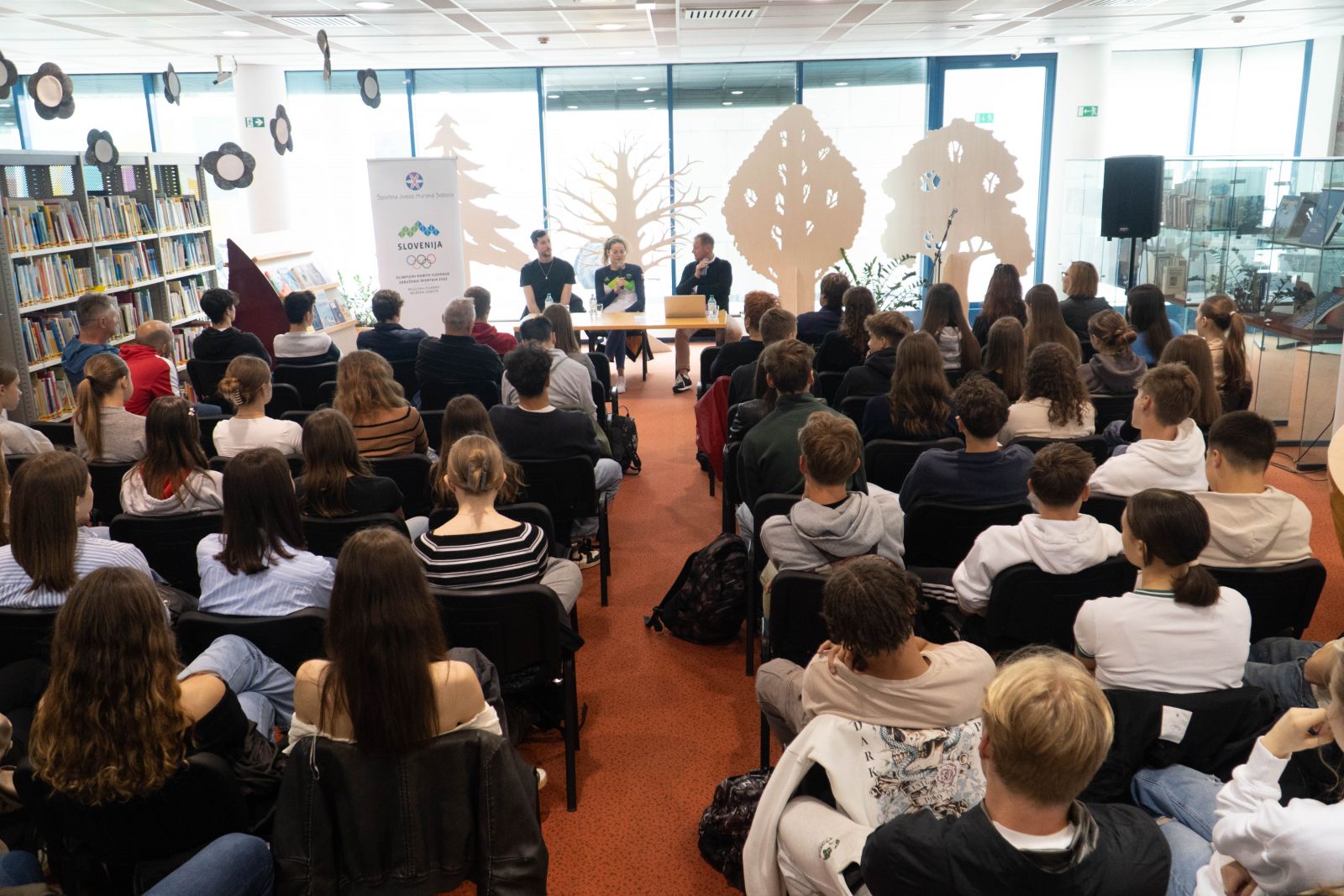 Na drugem srečanju #ŠIB 2024, ki ga je gostila Pokrajinska in študijska knjižnica Murska Sobota, se je znova tkala, prepletala in iskrila vez med športom in branjem. Odlično pripravljena in razpoložena vrhunska športnika Katja Fain (plavanje) in Uroš Pavlović (odbojka) sta v zanimivem in doživetem pogovoru z moderatorjem Mariem Čepom dijakom Murskosoboške gimnazije in osnovnošolcem podala nekaj dragocenih izkušenj iz svojih športnih karier, ki sta ju nemalokrat spremljala tudi knjiga in branje.
