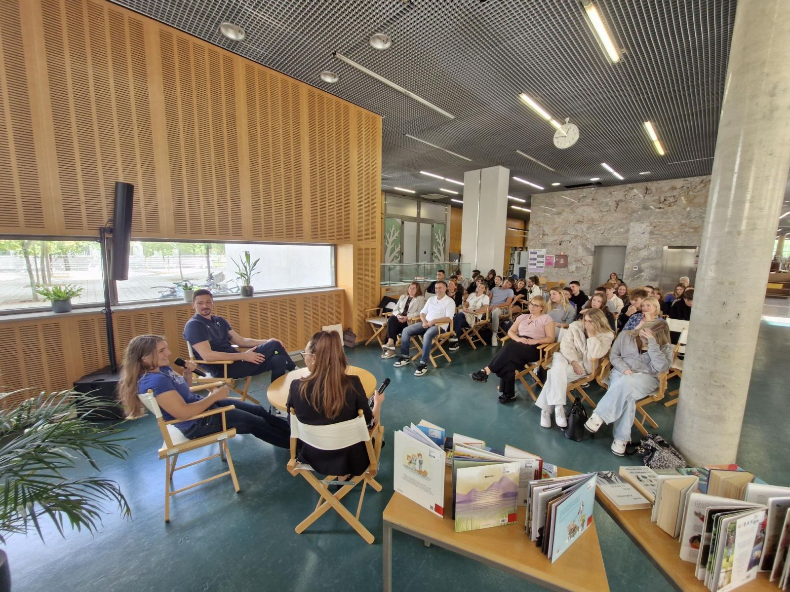 S tem sta pokazala, kako velika prvaka sta, kljub vsej svoji preprostosti in dostopnosti. Z nami sta bila olimpijska prvakinja v Judu z OI v Parizu 2024, Andreja Leški ter slovenski reprezentant in večkratni prejemnik medalj evropskih in drugih velikih prvenstev v odbojki ter tudi olimpijski reprezentant v tej športni disciplini, Dejan Vinčić. Pogovor je vodila Tina Podgornik, koordinatorica prireditev Goriške knjižnice, ki je v letih 2024 in 2025 tudi nosilka projekta #ŠIB za bralni del.