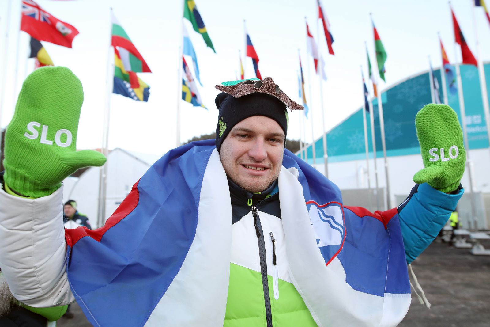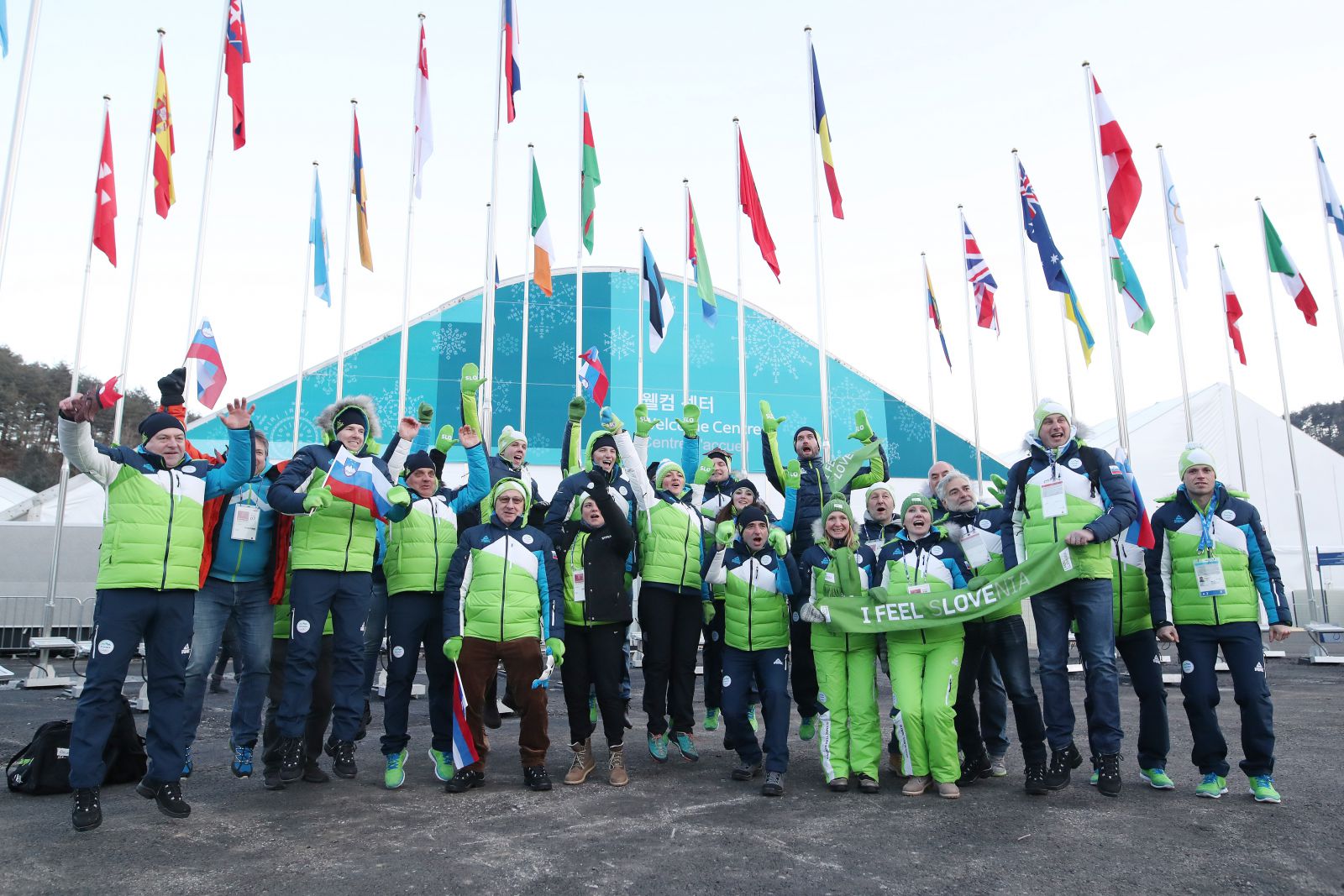 Ob olimpijskih reprezentancah Irske, Čila, Jamajke in Češke se je na drog osrednjega trga mednarodnega dela olimpijske vasi, ob zvokih Zdravljice, ponosno zavihtela tudi slovenska zastava. Kratek kulturni program, poudarek je bil na korejski tradiciji, nagovor župana vasi in izmenjava priložnostnih daril so že nekako stalnica omenjenega ceremoniala. Tako kot vodje ostalih olimpijskih reprezentanc je županu olimpijske vasi darilo izročil tudi vodja olimpijske reprezentance Slovenije Franci Petek; podaril mu je panjsko končnico in lično knjigo z naslovom Slovenija v sedmih dneh.