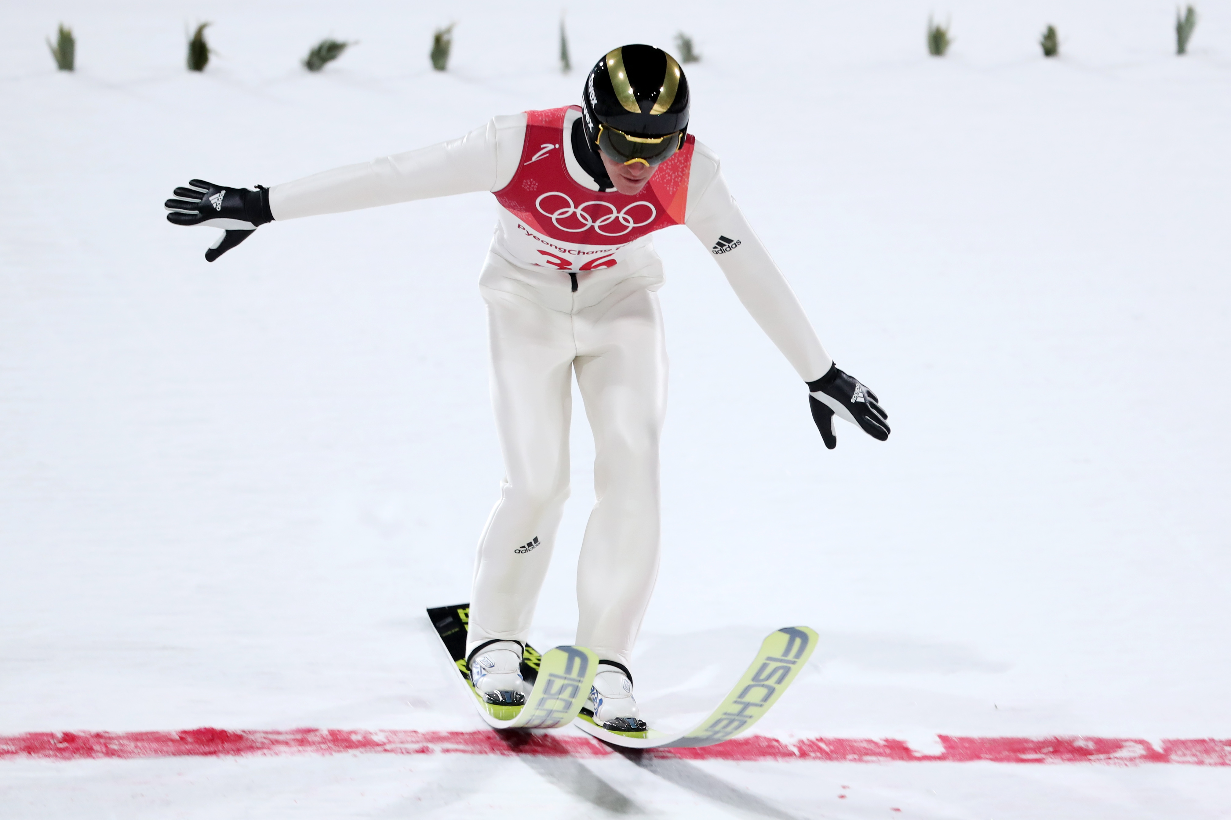 V zelo hladnem vremenu je veter močno vplival na razplet tekmovanja, prva serija pa je zaradi številnih prekinitev trajala več kot uro in pol, tudi v finalu ni bilo dosti drugače, je pa bila zaradi manjšega števila skakalcev nekoliko krajša. Vse skupaj je bilo precej oddaljeno od prave olimpijske preizkušnje in je bolj spominjalo na kaos, ki ga je v živo spremljalo le okrog 1000 gledalcev. V njem se je najbolje znašel 22-letni Wellinger za prvo nemško posamično medaljo v skokih po Jens Weissflogu in iger leta 1994 v Lillehammerju.
